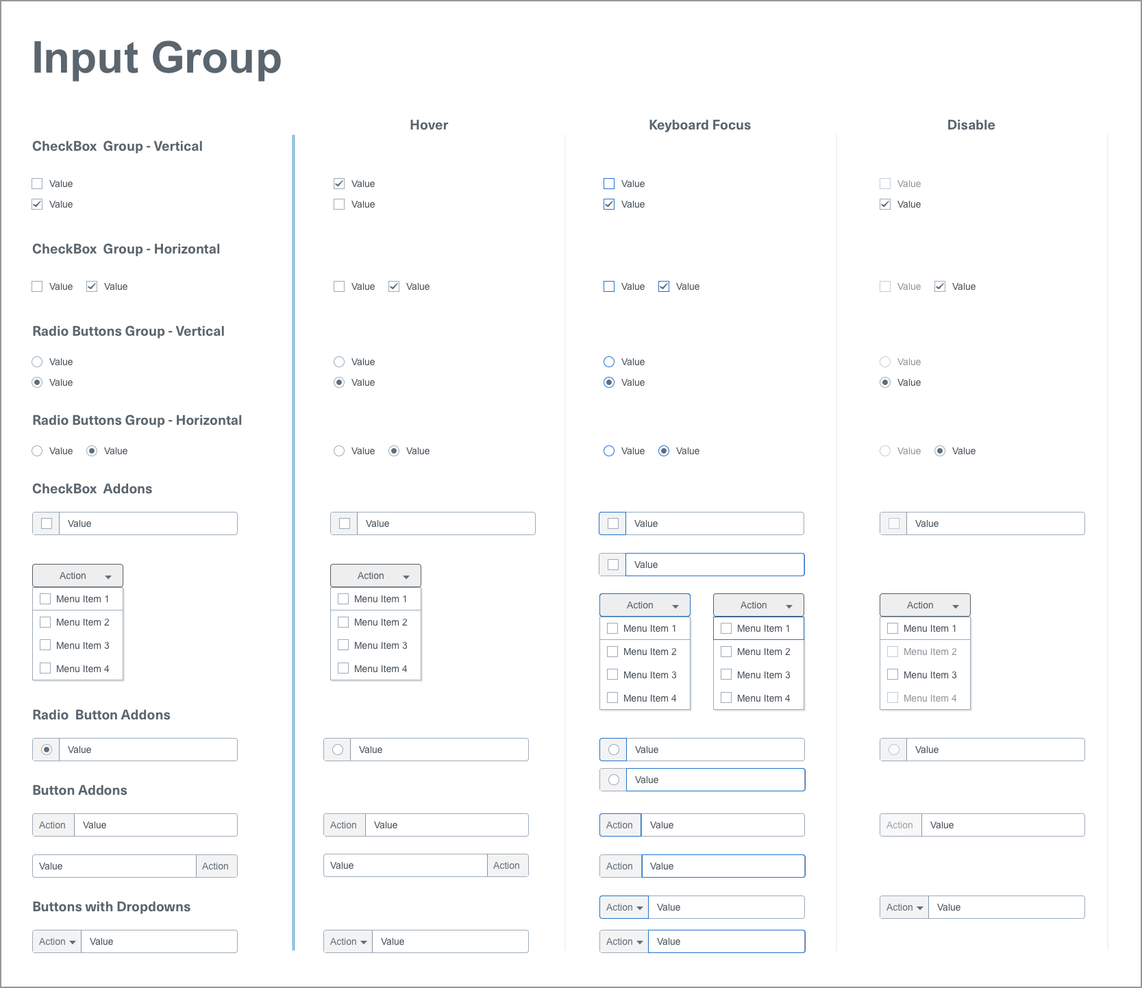 Edifecs Framework is a design system project to standardize UI components, icons, text styles and color palette across all Edifecs products. The project started out of the need to provide consistent user experience across core products at Edifecs. It also aimed at increasing efficiency of developers to develop UI components. Also, the current interaction and styling of the components needed a refresher. We wanted to make sure the components are compliant to accessibility guidelines like WCAG2.0.